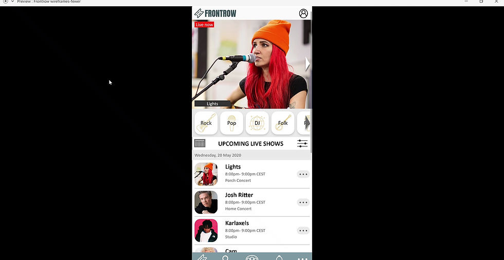 After reviewing the research and many brainstorming and affinity building workshops, we defined what we intended to have in our MVP. We wanted to have a live streaming site that had the capability to stream live concerts as well as have interactive VIP events that were more intimate. It was going to be imporant to have a paywall built into the product so that we could purchase tickets in the app. We decided that the project was going to be very expensive to build and that we would need financing in order to build it. Markus and I then put together our pitch deck to go out to finance our product. In the meantime, I worked to create the wire frames of the product so that we could more easily show investors the idea behind the product. Simultaneously, Johan worked on the backend of the product which we then began testing the functionality of.